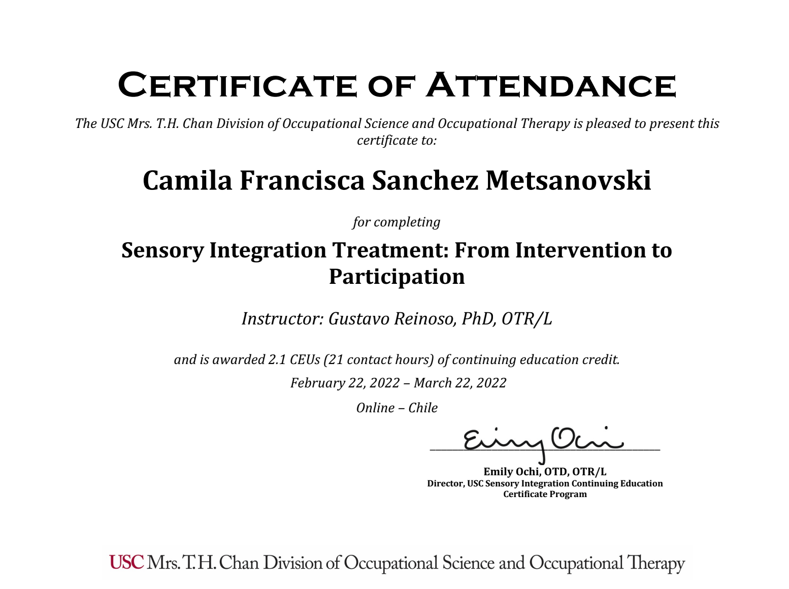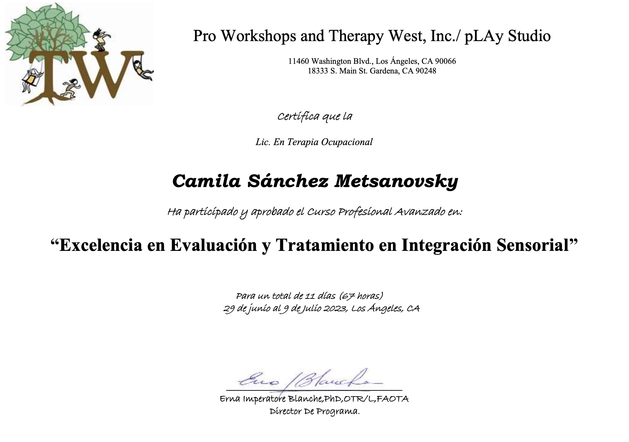 🤍Título de Excelencia en Evaluación e Intervención en Integración Sensorial (2023) formación presencial e intensiva dictada por Erna Blanche , Los Ángeles, California, EEUU. Aprobada con nota 7.0 en examen final.